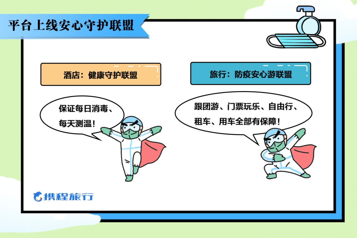 攜程等互聯網平臺,一方面發揮行業引導作用,率先在酒店行業發起“健康守護聯盟”,旅游中發起“防疫安心游聯盟”,引導全行業共同提升安全服務。另一方面針對性創新產品,打造“健康守護”、“安心游”標簽,開發新型戶外主題旅游。目前,攜程首批上線“安心游”跟團線路已超過5000條。