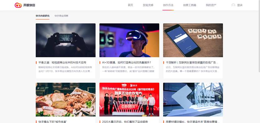 此外,“開眼快創”提供體系化學習板塊,整理了快手磁力引擎在營銷體系、產品技術、內容等方面的進化升級以及行業創意方法論,提供資訊分享、學習課程及研究報告,幫助商業化合作伙伴,了解行業發展一手信息,洞察短視頻商業價值,找到創意爆點,快速提升創意能力。