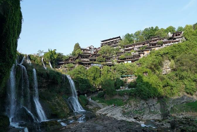 芙蓉鎮尤以坐落在瀑布之上而聞名。整個芙蓉鎮安坐于一塊陡峭的石灰巖臺地上,猛洞河穿鎮而過,在臺地的邊緣形成落差三十多米的雙層瀑布,古鎮就這樣與瀑布相得益彰。著名作家沈從文早年路過此處時曾評價道:“夾河高山,壁立拔峰。竹木青翠,巖石黛黑”,可謂這里最真實的寫照。