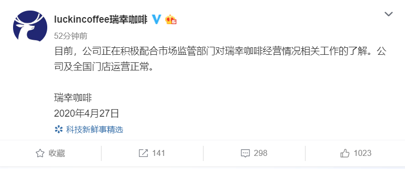 瑞幸咖啡:積極配合市場監管部門,公司與門店運營正常 李楠 ? 2020年4月27日 15:56 ? 新餐飲 速途網4月27日消息(報道:李楠)今日,有媒體稱證監會已派駐調查組進駐瑞幸咖啡,多位審計人員正在對瑞幸咖啡的財務狀況進行審計。 剛剛,瑞幸咖啡在微博回應稱,公司目前正在積極配合市場監管部門對經營情況相關工作的了解,公司及全國門店運營正常。 贊 (0) 李楠 0 生成海報 拼多多開啟旅游直播“云游中國”,首站落地湖南湘西芙蓉鎮 上一篇 2020年4月27日 15:34 MIUI 12超40款機型適配,小米10青春版配50倍潛望式變焦2099元起 下一篇 2020年4月27日 16:08