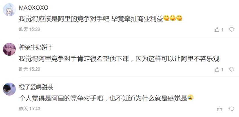 在相關微博評論中,我們看到有用戶提出此事牽扯商業利益,很有可能是阿里的競爭對手所為,并通過蔣凡下課,讓阿里產生焦慮,從而減慢阿里巴巴的發展步伐,為自己爭取一定的時間與空間。如今蔣凡雖遭重罰,但并沒有讓那些高呼“蔣凡必須下課謝罪”的幕后人如愿,阿里的競爭對手們,或許會失望了。