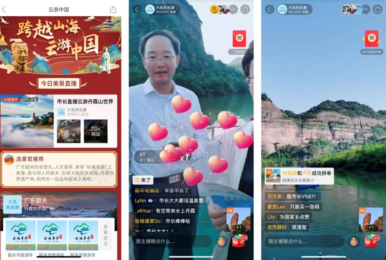 協(xié)議簽署后,拼多多大型旅游直播“云游中國(guó)·韶關(guān)站”活動(dòng)也正式開(kāi)啟,市長(zhǎng)殷煥明和副市長(zhǎng)李欣化身“金牌導(dǎo)游”,在拼多多直播間推介當(dāng)?shù)刂牡は忌斤L(fēng)景區(qū),并現(xiàn)場(chǎng)派發(fā)出10000張酒店折扣優(yōu)惠券和60000張“1元景區(qū)門(mén)票”,累計(jì)吸引全網(wǎng)觀(guān)看人次超455萬(wàn)。
