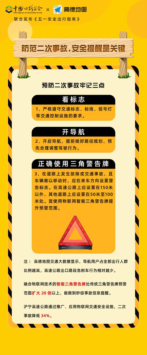 此外,為了給五一出行增加一道“安全鎖”,高德地圖在五一前夕正式推出了智能三角警告牌,通過在傳統(tǒng)三角警告牌上增加定位模塊和通訊模塊,將預(yù)警范圍擴大20倍以上,實時向后方來車提示事故信息,從而降低二次事故風(fēng)險。