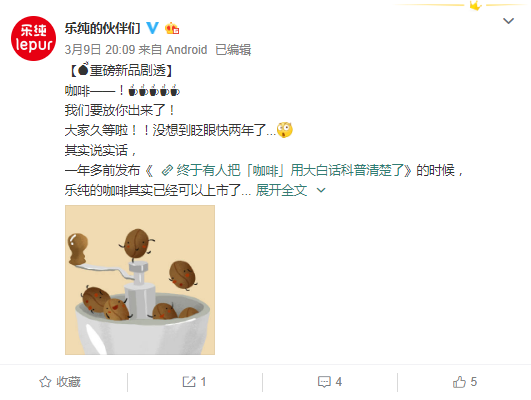 今年3月,樂純開始在其官方微博“樂純的伙伴們”發(fā)布新品預(yù)告,并表示一年多前隨著文章的發(fā)布樂純咖啡本可以上市,但出于對樂純創(chuàng)新精神的尊重,咖啡新品不斷迭代,直至現(xiàn)在才面世。