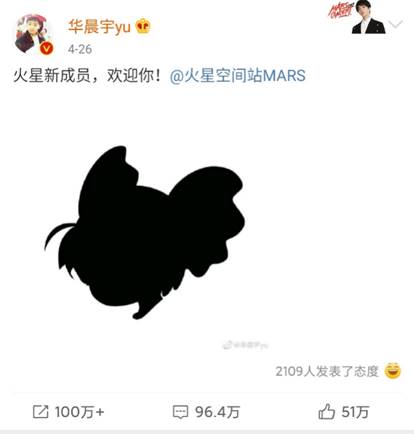 4 月 26 日,華晨宇更新了微博動態,分享了一張來自火星空間站的鼠鼠的剪影,推出「火星空間站MARS 」賬號,轉發量過百萬。工作室、官方微博相繼轉發「火星空間站」公眾號二維碼,火星空間站瞬間成為大家的新陣地。