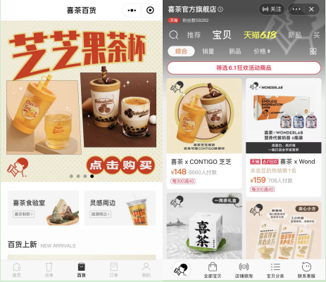 在小程序“喜茶GO”中,喜茶開辟“喜茶百貨”專欄,專門售賣各項喜茶聯(lián)名款以及自制食品。而天貓喜茶官方旗艦店,也是如此。