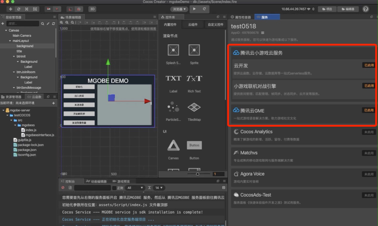在調用層面,開發者只需在Cocos Service服務面板內點擊按鈕開通,即可快速調用,無需注冊第三方賬號、下載SDK再集成,最快3分鐘即可接入調用。