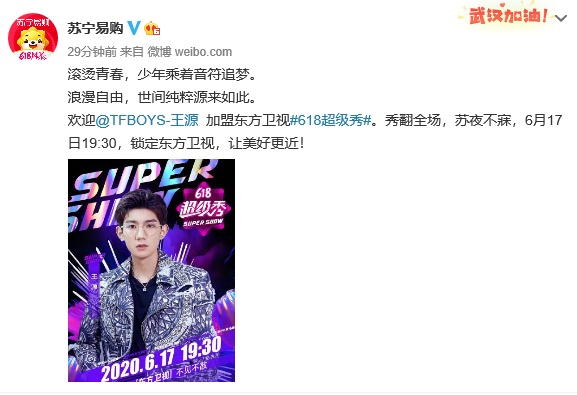 速途網(wǎng)6月8日消息(報(bào)道:李楠)今日,蘇寧易購(gòu)先后官宣王源、任嘉倫、張杰加盟蘇寧618超級(jí)秀。