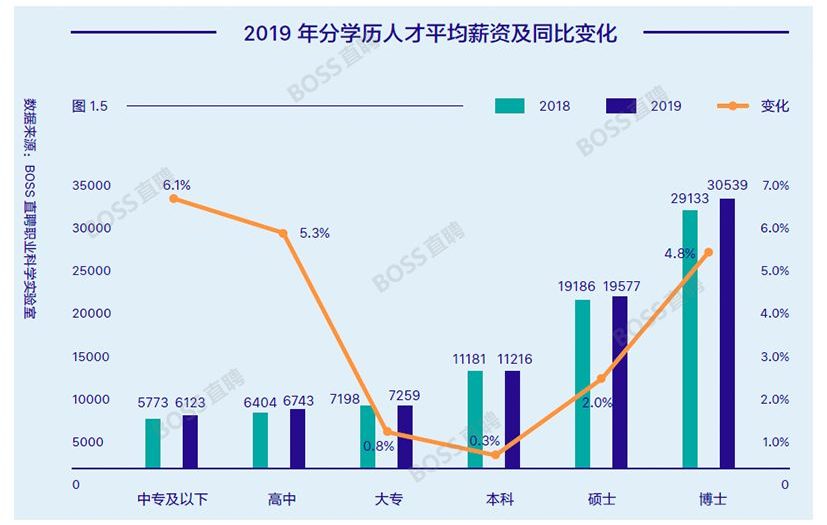 學歷提升關系到求職者在求職時的競爭力,也關系到求職者的薪酬待遇。根據Boss直聘在2019年12月發布的《2020人力資本趨勢報告》顯示,本科學歷人才的平均薪資比高中畢業學歷人才高出近5000元,比大專學歷人才高出近4000元。而碩士學歷人才的平均薪資與本科及大專學歷人才的懸殊更大。