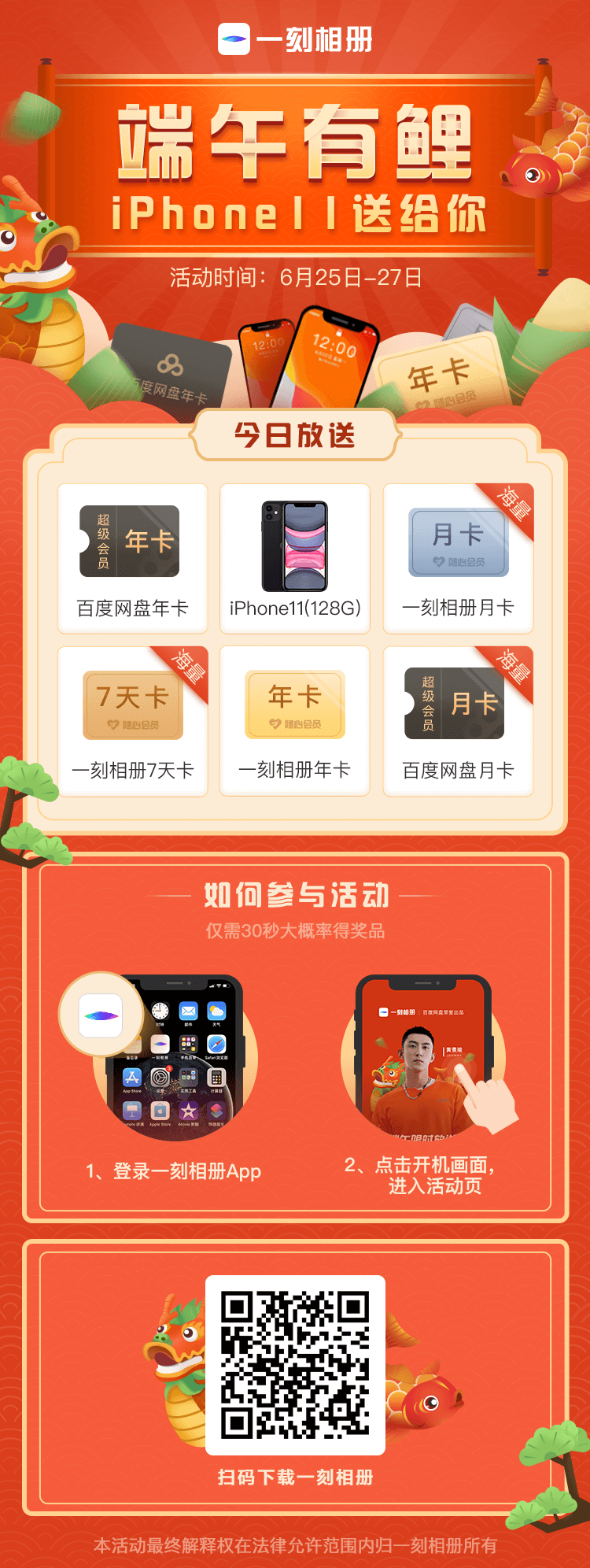 又是一年粽香四溢的端午佳節,一刻相冊攜手百度網盤推出了“端午有鯉”抽獎活動。即日起至6月27日,新老用戶均可登陸一刻相冊參與抽獎,贏取 iPhone11、百度網盤超級會員卡和一刻相冊隨心卡等千份超值大獎。速來參加活動,康康你是不是“錦鯉本鯉”吧!