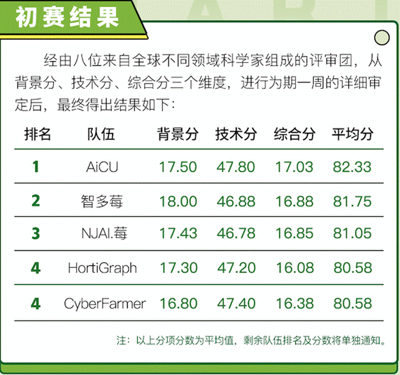 6月24日,經(jīng)過(guò)為期一周的激烈角逐和專家評(píng)審后,第一屆“多多農(nóng)研科技大賽”初賽結(jié)果出爐,在參與初賽的17支科技組隊(duì)伍中,共有4支年輕隊(duì)伍脫穎而出,分別是AiCU隊(duì)、智多莓隊(duì)、NJAI.莓隊(duì)、CyberFarmer·HortiGraph隊(duì)。