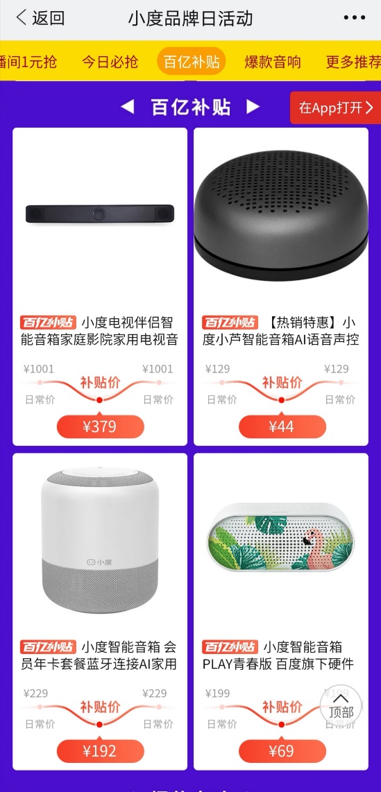 在“小度品牌日”活動期間,拼多多“百億補貼”也將覆蓋多款小度產品。其中,小度電視伴侶智能音箱補貼價只需379元;小度智能音箱PLAY青春版補貼價只需69元;小度小蘆智能音箱補貼價只需44元,均為全網最低價。