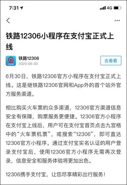 12306官方支付寶小程序通過支付寶實(shí)名認(rèn)證即可登錄,無需每次輸入密碼,忘記密碼也不怕。此外,這一服務(wù)也整合進(jìn)了支付寶“我的應(yīng)用”里的“火車票機(jī)票”服務(wù),用戶可將其編輯進(jìn)支付寶首頁。支付寶有服務(wù)全球12億用戶的經(jīng)驗(yàn),將會和12306一同,進(jìn)一步提升購票體驗(yàn)。