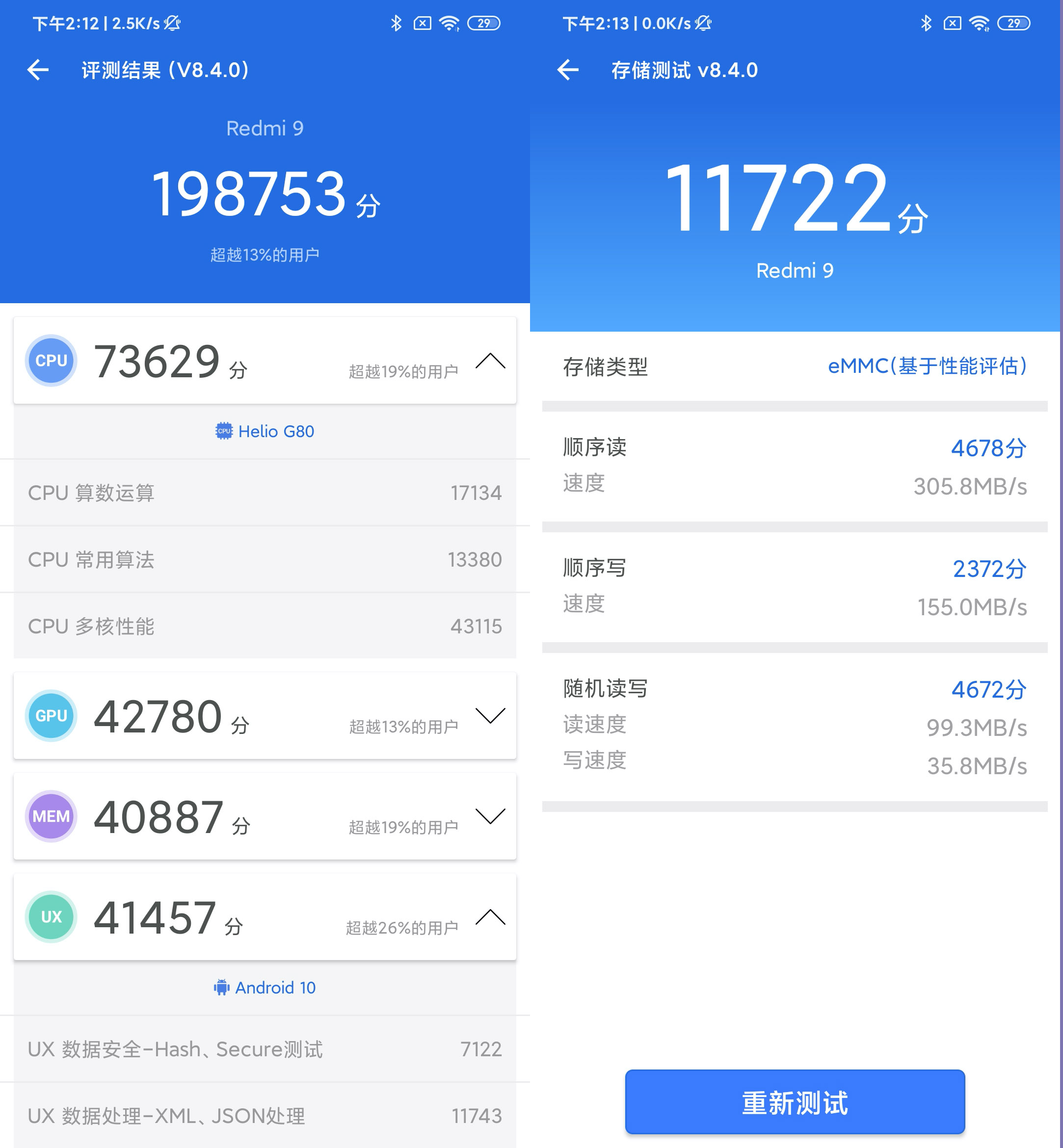 跑分方面,Redmi 9安兔兔跑分成績接近20萬,根據存儲測試結果順序讀速度為305.8MB/s,從分數上屬于今年的入門級別處理器。
