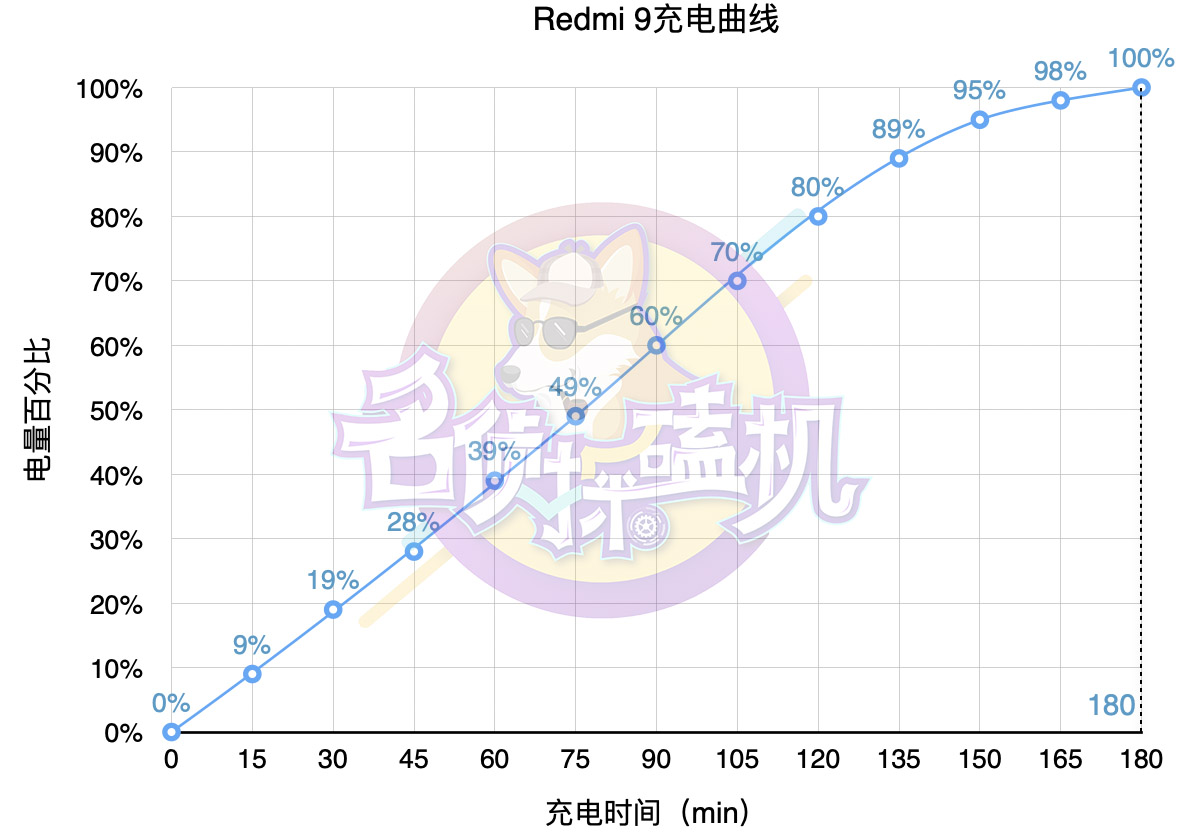 充電方面,Redmi 9支持最高18W快充,不過官方隨機贈送的充電頭僅有10W。使用標配的充電頭為Redmi 9充電,充電共耗時180分鐘。雖然充電時間比較長,但由于手機本身續航較長,完全可以堅持到睡覺前把手機插在電源上充電。