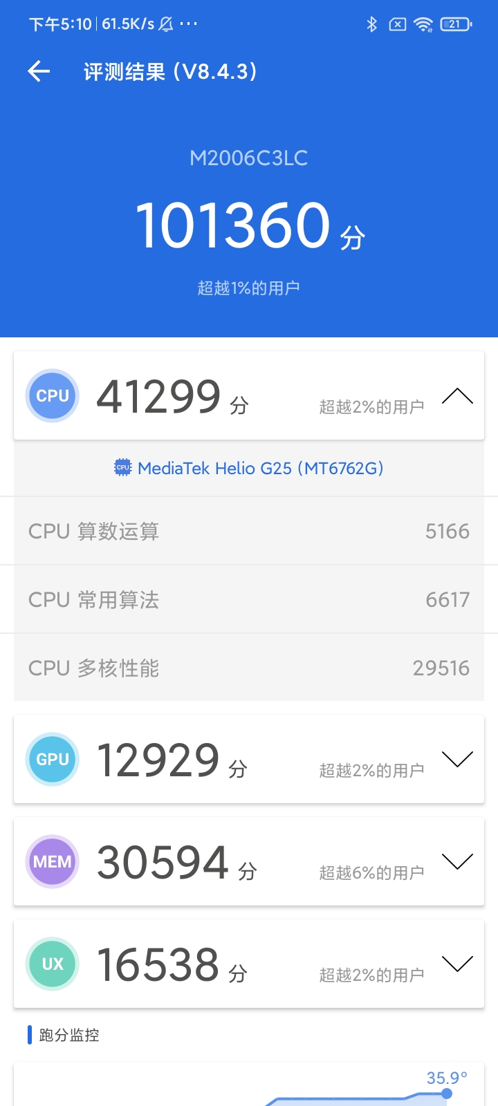 性能方面,Redmi 9A搭載了12nm工藝制程的MTK Helio G25處理器,采用8核A53架構,主頻最高2GHz,GPU為PowerVR GE8320。實測,Redmi9A安兔兔跑分超過10萬分。
