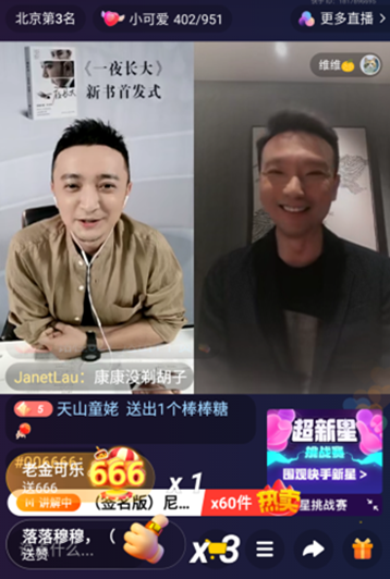 直播最后,尼格買提還與快手讀書達人“塵客將軍”(快手ID:103332)連麥,暢聊“為什么書名叫《一夜長大》”“有沒有印象深刻的成長瞬間”等話題。