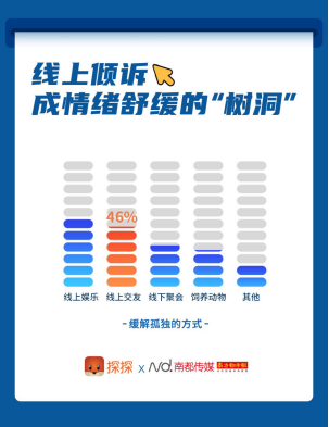 在本次調研中,單身未婚樣本占比高達91.83%,他們中49.64%的被調研用戶表示“目前一個人居住”,是典型意義上的獨居青年。值得注意的是,線上交友成為不少獨居青年們緩解孤獨的“必選項”,占比高達46%,通過探探這類社交軟件來結識新朋友,讓獨居生活不那么孤單;同時,刷短視頻、玩游戲、追熱劇等線上娛樂以及飼養寵物,也成為很多獨居青年豐富生活的多元方式。