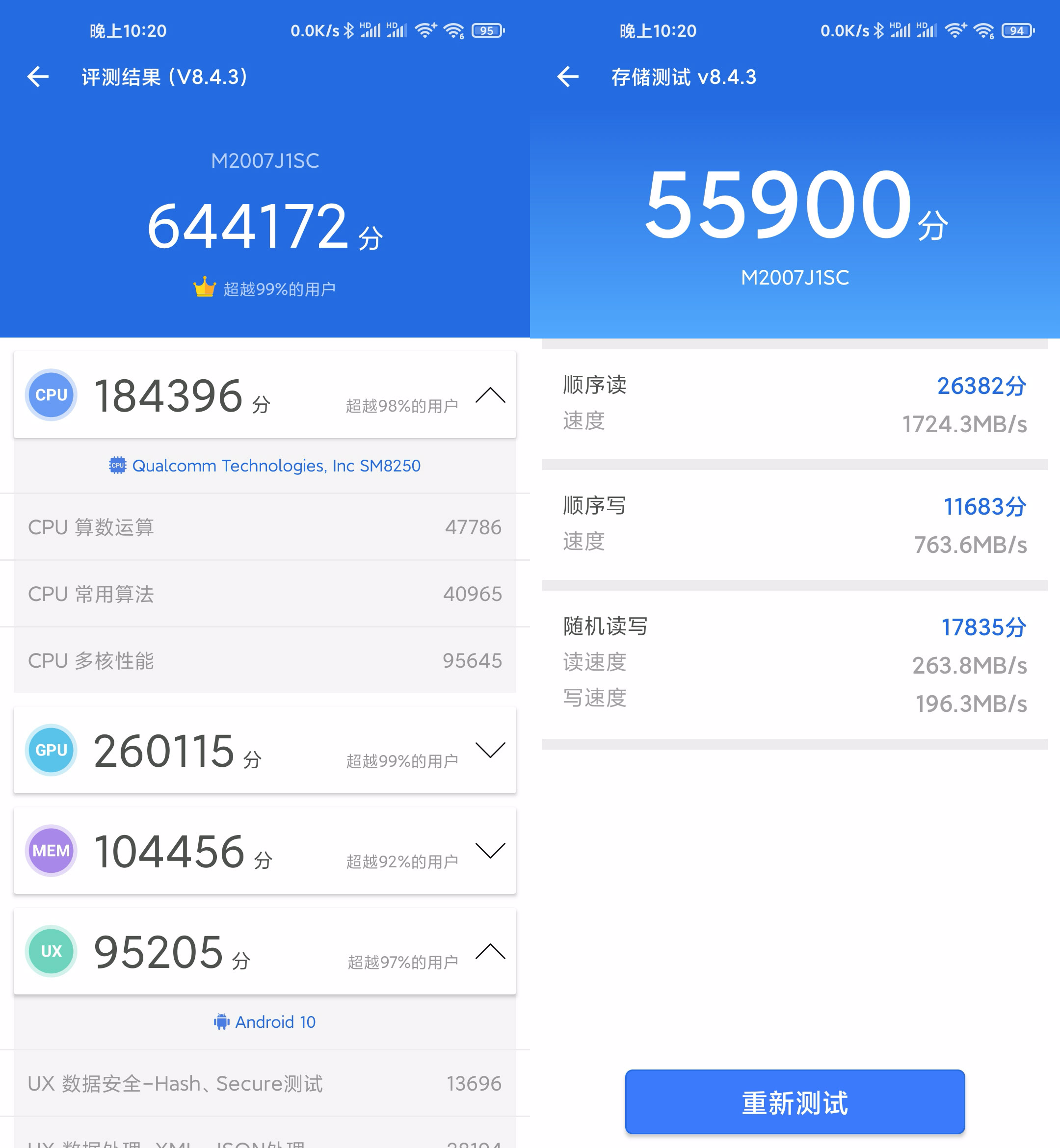 性能方面,小米10至尊紀念版在原高通驍龍865處理器、LPDDR 5內存這些2020年頂級配置的基礎上,閃存方面升級到了UFS3.1規格,讀寫速度再次小幅提升。跑分方面,小米10至尊紀念版安兔兔跑分輕松超過64萬分。