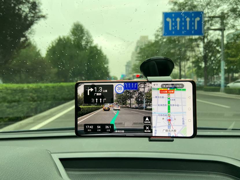 在使用AR導航過程中,需要將手機橫屏固定在車前方視野較好的地方。由于攝像頭需要一直打開容易消耗電量,建議用戶連接車載充電器使用。此外,AR技術運算量較大,手機性能越高使用體驗也越佳。