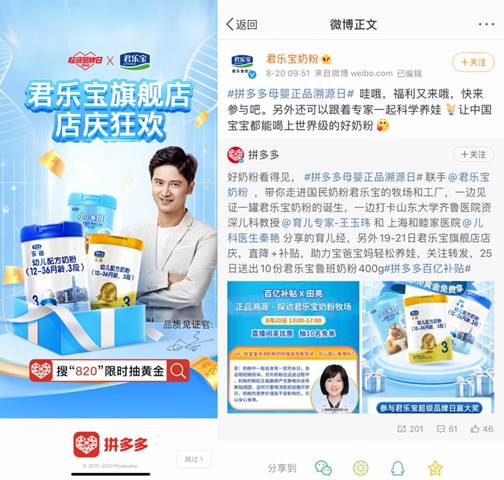 8月20日,拼多多“母嬰產品溯源行動”走進國民奶粉君樂寶的工廠,用在線直播的方式帶消費者探訪世界級牧場和工廠。當天近40萬寶爸寶媽見證了國產好奶粉誕生的全過程,同時直播間君樂寶全系奶粉都以全網最低價呈現,讓億萬中國寶寶喝到優質平價的國產奶粉。