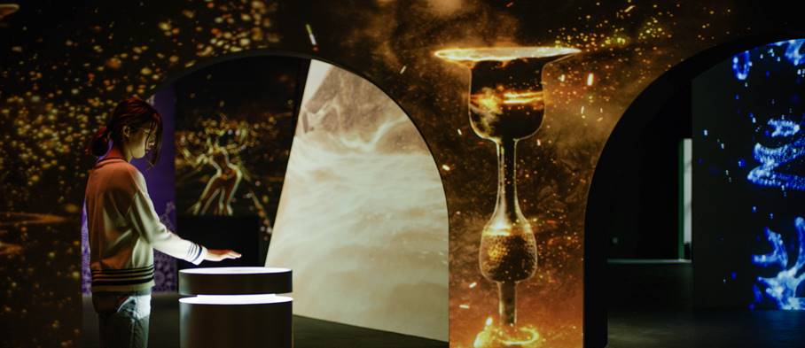 基于文物背后不同的文化主題,展覽打造了五個(gè)主題空間,觀眾可以在展覽構(gòu)建的不同“時(shí)空艙”中感受多種文化內(nèi)涵。例如,在“天人相合:神明與禮制”主題下,觀眾可以了解青銅器背后蘊(yùn)藏的禮制與祭祀文化;在“有典有章:理性與秩序”主題下,以數(shù)字形式體驗(yàn)兵馬俑,感受秦文化的風(fēng)采;在 “美善合一:匠心與技道“主題下,感受古人生活的智慧與藝術(shù);在 “翰墨文心:風(fēng)骨與氣韻”主題下,沉浸體驗(yàn)數(shù)字化構(gòu)建的“曲水流觴”意境;在“文以化之:交流與融合“主題下,觀眾身臨其境感受絲綢之路上的文化融合。