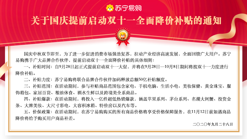9月28日,蘇寧易購率先啟動了雙十一,把壓箱底的尖貨全部前置到雙節長假,用蘇寧內部的話說就是“與雙十一同等級別的大促”。