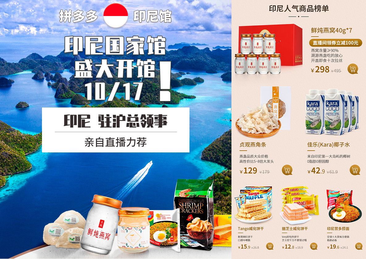 10月17日,拼多多“印尼國家館”重磅上線,印尼駐上海總領事戴寧與拼多多副總裁陳秋出席了上線儀式,并攜手為場館揭幕。“印尼國家館”一站式匯集了燕太太燕窩、麗芝士威化、佳樂椰子水、營多撈面、意立詩護發(fā)精油等二十多款印尼標志性的滋補、美食及個護產(chǎn)品,其中不少都享受拼多多“百億補貼”全網(wǎng)最低價優(yōu)惠。