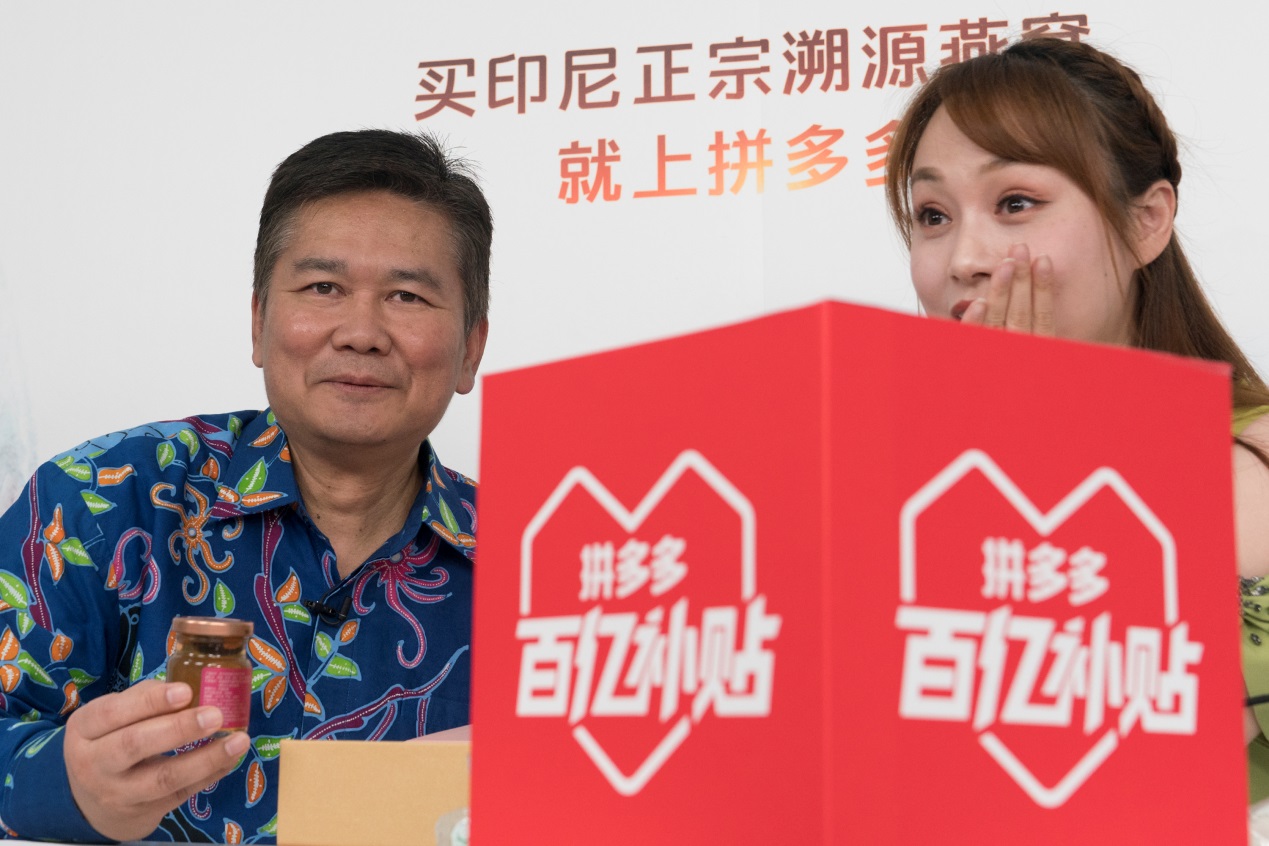 ▲戴寧(左)身穿印尼傳統(tǒng)服飾巴迪衫(Batik)做客拼多多“百億補貼”直播間。穆功 攝