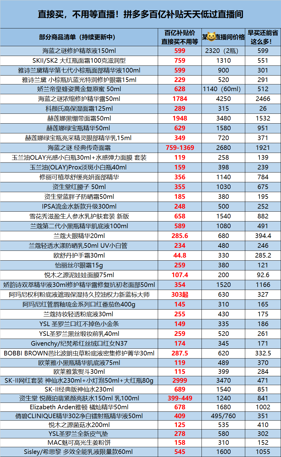 ▲拼多多公布的部分大牌美妝專區產品價格列表,海藍之謎、雅詩蘭黛、SK-II、蘭蔻、資生堂等美妝品牌均有大幅優惠,單件產品最高可省2000元以上。