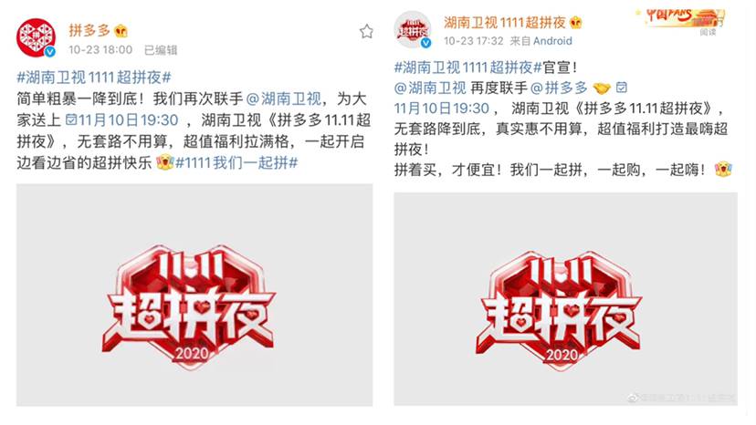 速途網(wǎng)10月25日消息(報(bào)道:李楠)日前,拼多多宣布將聯(lián)合湖南衛(wèi)視在11月10日晚黃金檔舉辦“11.11超拼夜”晚會(huì),攜手?jǐn)?shù)十位人氣明星為消費(fèi)者帶來精彩紛呈的表演,并送出重磅福利。