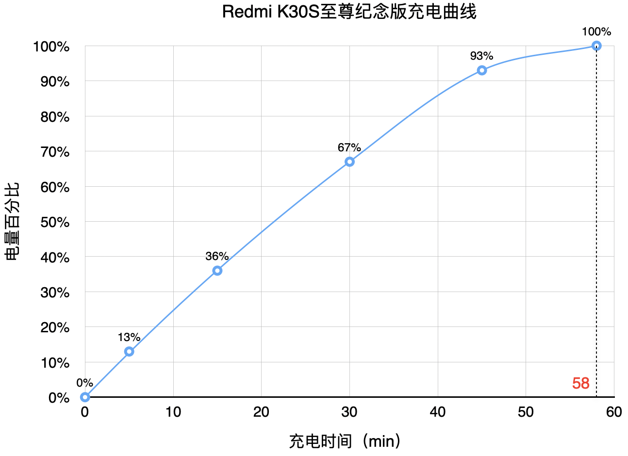 充電方面,Redmi K30S至尊紀念版支持33W有線快充,實測使用原裝充電器材為手機充電,0-100%充電僅需用時58分鐘。