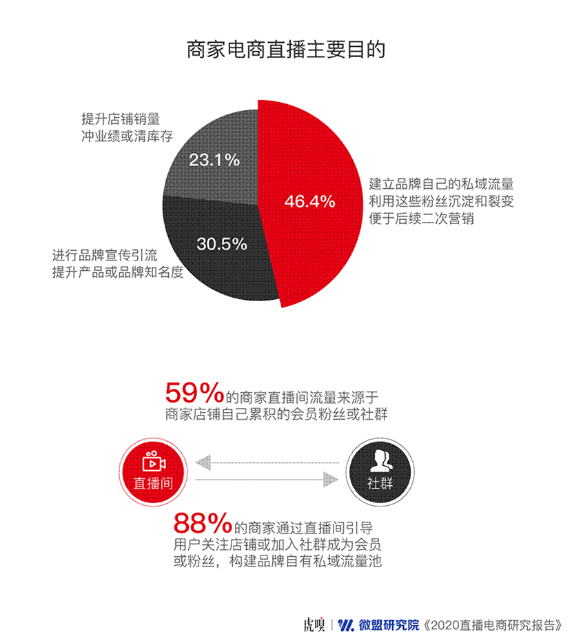 這一過程中,私域流量的價值正在被商家所重視,虎嗅聯合微盟研究院調查問卷表明,已經有46%的商家意識到做直播的目的是為了建立品牌私域流量,59.1%的商家直播間流量的主要來源之一就是商家自己累積的會員粉絲以及社群,即“私域流量”。在直播運營中,有88%的商家已經有意識地引導用戶關注店鋪或加入社群,通過此種方式構建私域流量,進行后續的二次營銷和推廣,來達到流量變現目的。也有商家選擇建立自己的私域直播間,培養自己的主播和商家自播體系。