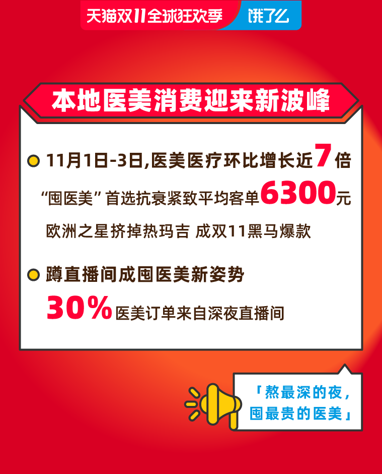 餓了么數(shù)據(jù)顯示,11月1日-3日,醫(yī)美醫(yī)療銷售較618增長近7倍。“抗衰緊致”成消費者“囤醫(yī)美”的最首要訴求。