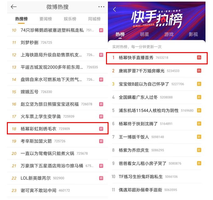 在掃樓期間,楊冪也在其快手賬號(快手ID:2115776392)進行全程直播,吸引了眾多網(wǎng)友的關(guān)注。1小時的直播,直播間總觀看量達1059.9W,總互動量3415.7W;在快手站內(nèi),#楊冪快手直播首秀#話題登上快手當日熱搜榜第一名,總曝光量達2114W;#楊冪終于扶到沈騰了#登上快手熱搜榜第三名,總曝光量達1674W;直播全網(wǎng)獲億級曝光,微博熱搜登上Top18,知乎熱榜Top23,數(shù)據(jù)喜人。