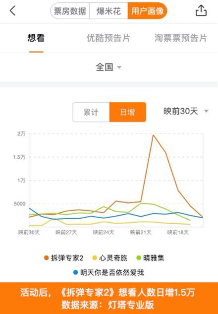 12月4日,《拆彈專家2》主創(chuàng)與薇婭進(jìn)行了一場(chǎng)破圈式的“沖擊播”線上路演。本次線上路演不僅創(chuàng)下66萬張售票量的行業(yè)新紀(jì)錄,同時(shí)成為影片營(yíng)銷的有效助力:社交媒體刷屏,相關(guān)話題連續(xù)五天登上微博熱搜。燈塔專業(yè)版數(shù)據(jù)顯示,12月5日,影片的單日想看人數(shù)陡增1.5萬,想看趨勢(shì)上升明顯。