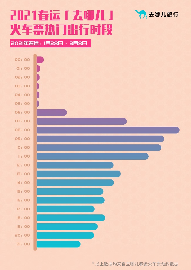 此外,去哪兒基于旅客預約車次的出發時間,發現早晨8至9點為全天出行最集中的時間段,其次是9至10點。而凌晨3至6點則為全天出行量最低時段。