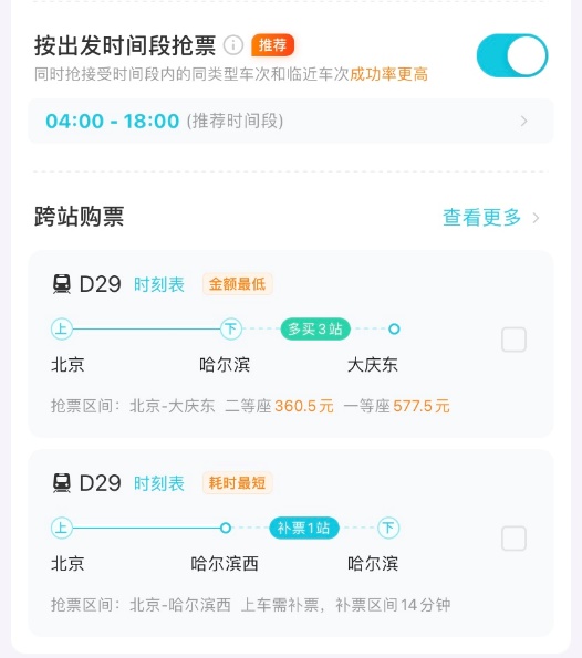 去哪兒還將為旅客智能推薦如臨近日期機票比價、中轉線路推薦、跨站購票以及按出發時間段搶票等多種出行方案。