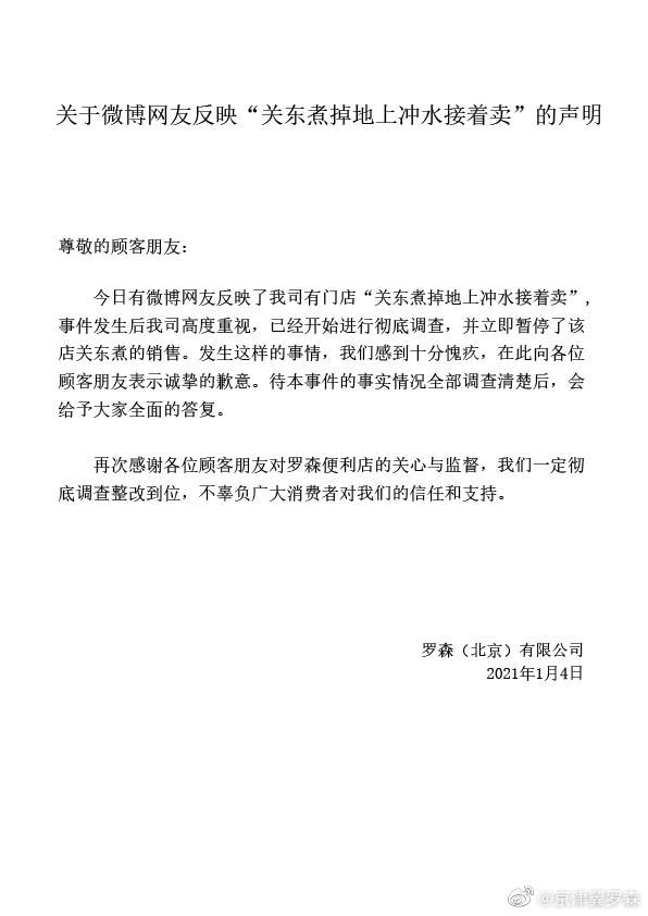 羅森回應“關東煮掉地上沖水接著賣”:徹底調查,暫停該店關東煮售賣 李楠 ? 2021年1月5日 13:33 ? 資訊, 零售 速途網1月5日消息(報答:李楠)今日,羅森回應“關東煮事件”。羅森在聲明中表示,已對該事件進行徹底調查,并立即暫停該店關東煮的銷售。 羅森還在聲明稱,對于該事件感到十分愧疚,待本事件的事實情況全部調查清楚后,會給予大家全面的答復。 贊 (0) 李楠 0 生成海報 聚好看發布2020生態屏白皮書,引領后疫情時代家庭AI服務變革 上一篇 2021年1月5日 11:33 好車主互助榮膺3·15履行社會責任承諾單位 下一篇 2021年1月5日 13:33