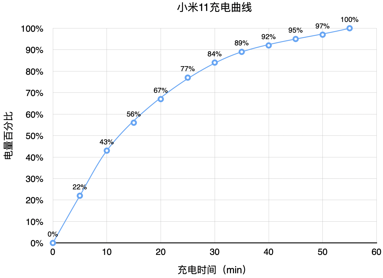 實(shí)測使用快充套裝版的充電器為小米11充電,0-100%共耗時(shí)55分鐘,其中前期充電速率可以保持在50W以上,前20分鐘即可充入67%電量。