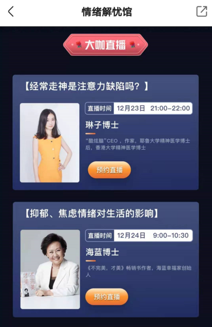 還有著名心理學者、情商教育專家、美國佐治亞理工心理學博士張怡筠;復旦大學醫學博士、美國德洲貝勒醫學院精神科博士后,《不完美,才美》暢銷書作者海藍博士;“酷炫腦”CEO ,作家,耶魯大學博士后,香港大學博士琳子博士;湖南司法行政戒毒系統二級警長,臨床心理醫師劉騫等,多達30位行業專家,每天在「情緒解憂館」開啟數場直播,涵蓋情緒管理、心理健康、兒童心理、社交心理等維度。
