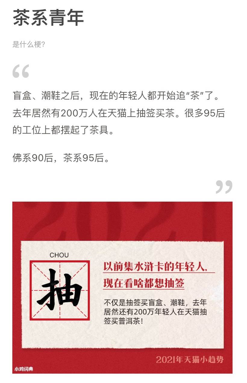 比如你可能想象不到,現在的年輕人眼中,追潮鞋、盲盒已經稀松平常,更潮的人居然開始追茶葉了。而且連茶葉也可以抽簽。數據顯示,去年一年,有200多萬人在天貓抽簽買茶葉。甚至還帶火了一個詞:“茶系95后”。