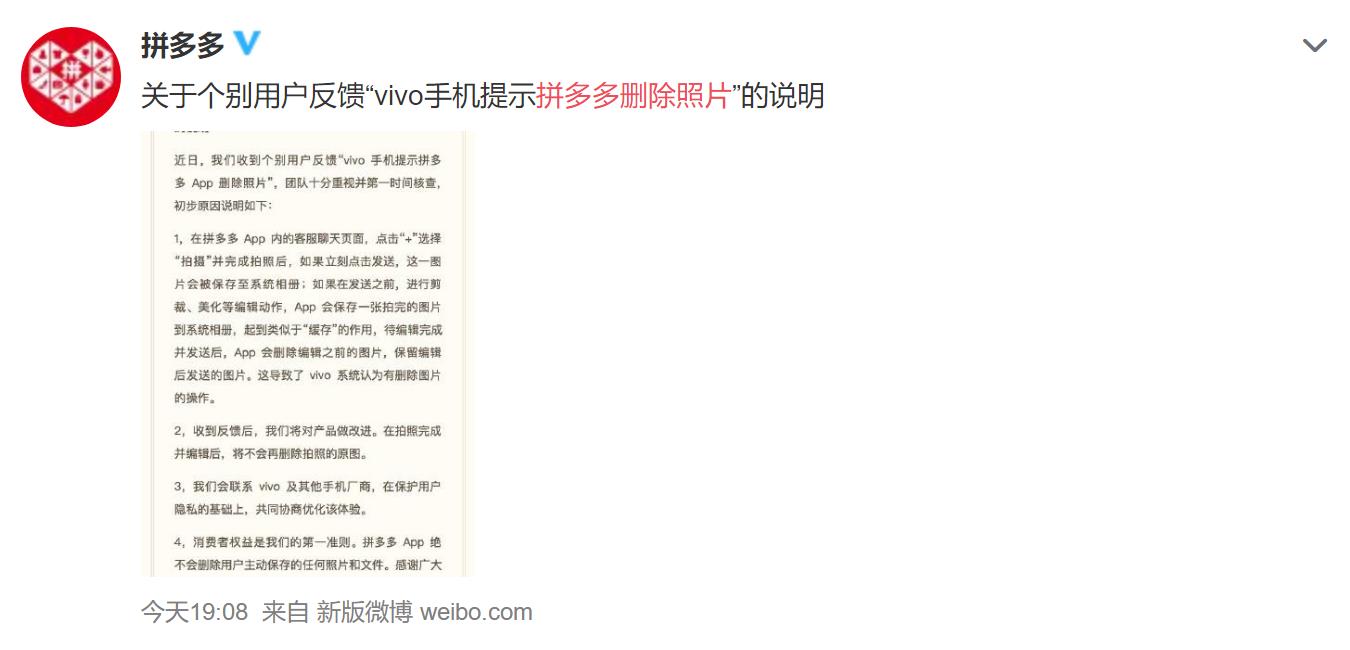 聲明稱,在拼多多App內的客服聊天頁面,點擊“+”選擇“拍攝”并完成拍照后,如果立刻點擊發送,這一圖片會被保存至系統相冊;如果在發送之前,進行剪裁、美化等編輯動作,App會保存一張拍完的圖片到系統相冊,起到類似于“緩存”的作用,待編輯完成并發送后,App會刪除編輯之前的圖片,保留編輯后發送的圖片。這導致了vivo系統認為有刪除圖片的操作。