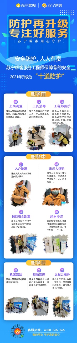 記者獲悉,去年疫情期間,蘇寧幫客推出了“九道防護”服務,通過“全方位防護”的嚴格標準立標行業。今年面對疫情反彈,蘇寧幫客再度將服務標準升級為“十道防護”,全面覆蓋家電、家居、家政、家裝等類目的安裝、維修、清洗、保潔服務。要求全國10萬名服務工程師嚴格遵守當地政府的防控要求,進一步提升作業規范和安全保障。
