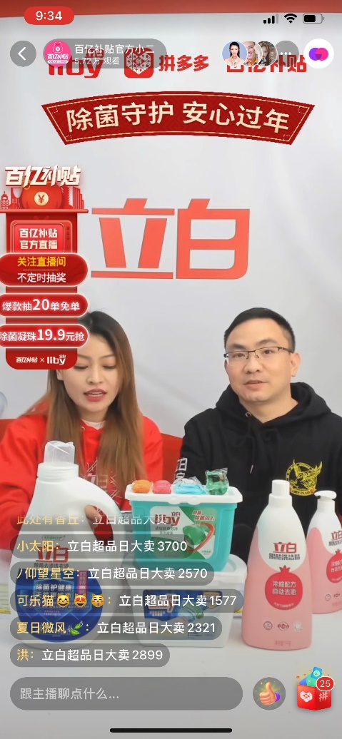 洗洗刷刷過大年。又到一年清洗季,作為拼多多年貨節重點合作的洗滌品牌之一,立白于1月18日推出以“除菌守護 安心過年”為主題、為期兩天的超級品牌日活動,吸引了數十萬網友搶購、囤貨。