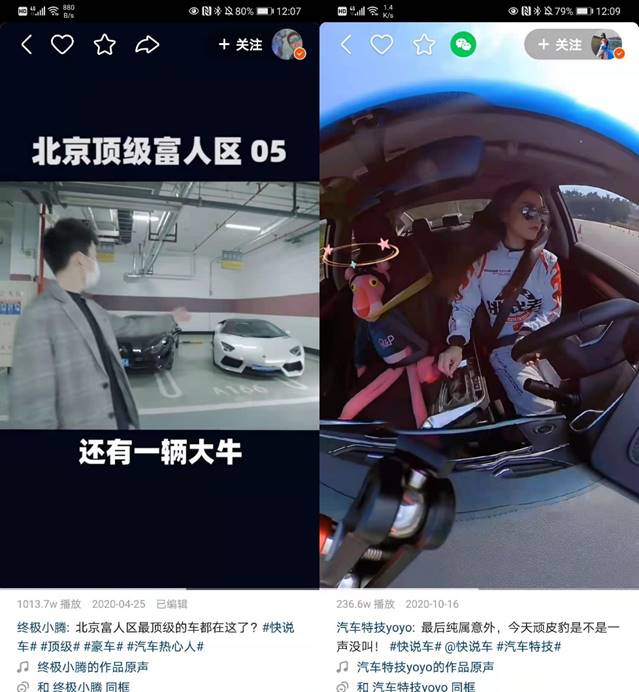 為了滿足汽車用戶對(duì)內(nèi)容的多樣化需求,快手也涌現(xiàn)了聚焦不同內(nèi)容方向的主播,比如高能創(chuàng)作者終極小騰、汽車特技yoyo、大可說(shuō)車、老丈人說(shuō)車、玩車報(bào)告。其中,終極小騰逛遍了國(guó)內(nèi)豪華酒店與富人區(qū)的地下停車庫(kù),滿足了車迷們對(duì)于富人座駕的好奇心;汽車特技yoyo則有地表最強(qiáng)女司機(jī)之稱,跑出各種高難度汽車特技,讓觀眾大呼過(guò)癮。