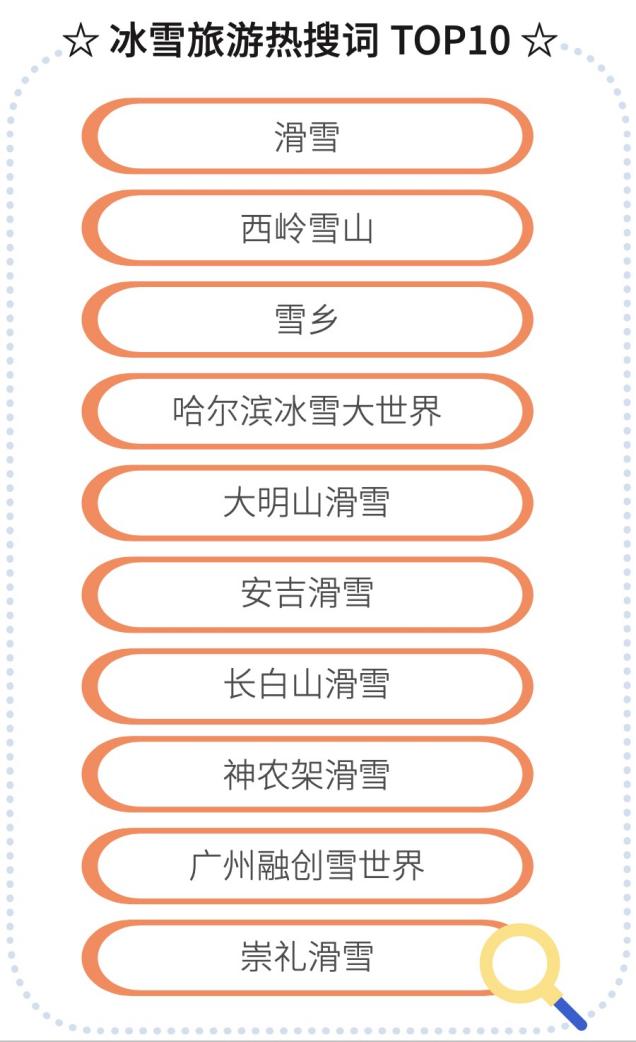 入冬以來,”滑雪”、”賞雪”、”看雪”等冰雪旅游相關的關鍵詞搜索熱度均出現大幅上漲。即便不是深度滑雪愛好者,很多休閑度假游客也會選擇在行程中安排半天到一天滑雪體驗。大明山、安吉、長白山、神農架、崇禮等知名滑雪場所在地也成為冰雪旅游的熱搜詞。