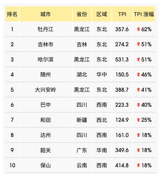 報告顯示,北方眾多冰雪旅游城市在第四季度迎來旅游旺季,黑龍江省牡丹江市TPI指數上漲62%,成為TPI漲幅最高的境內城市。吉林市、哈爾濱、大興安嶺等熱門冰雪旅游目的地的TPI指數漲幅都超過40%,位列TPI指數漲幅榜前5位。