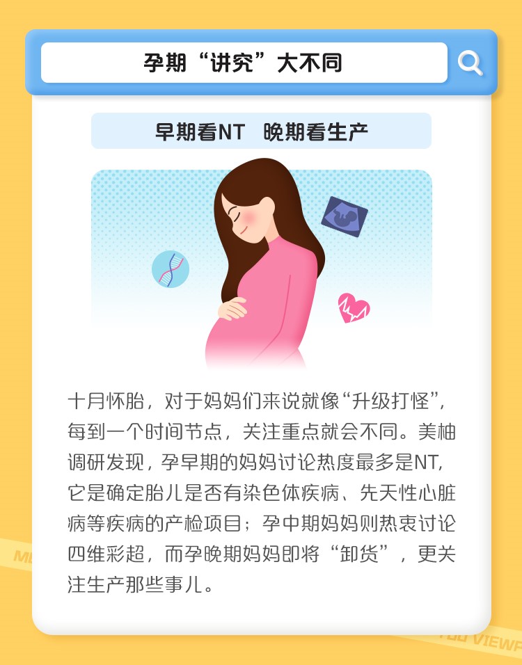 美柚報告顯示,在美柚她她圈與孕期相關的圈子——孕早期、孕中期和孕晚期媽咪圈中,準媽媽們的討論點各有側重。