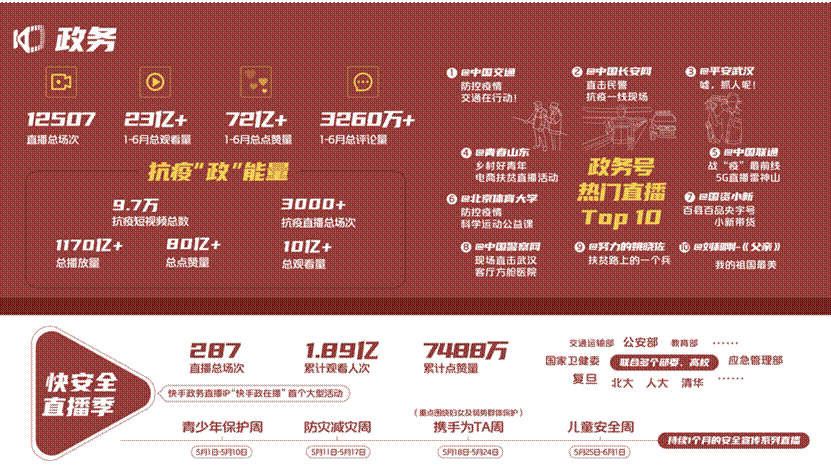 據(jù)了解,快手已在政務(wù)活動(dòng)方面積累了豐富的經(jīng)驗(yàn)。2020年5月1日,快手聯(lián)合國(guó)家衛(wèi)健委、交通運(yùn)輸部、教育部等多單位共同發(fā)起大型系列直播活動(dòng)“快安全直播季”。匯聚多家活躍在快手且有較大影響力的政務(wù)號(hào),聚焦安全主題,傳播安全知識(shí),教授安全技能。